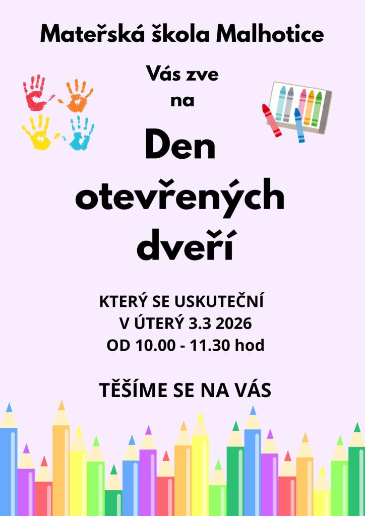 Mateřská škola Malhotice srdečně zve všechny zájemce na Den otevřených dveří, který se bude konat v úterý 3. března 2026. Akce proběhne od 10:00 do 11:30 hodin. Přijďte se seznámit s naším prostředím a pedagogickým přístupem. Těšíme se na vaši návštěvu a rádi vám zodpovíme vaše dotazy.